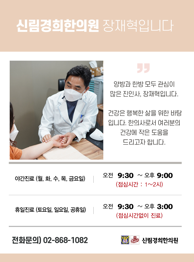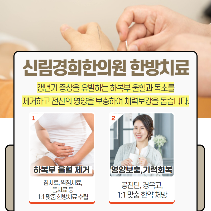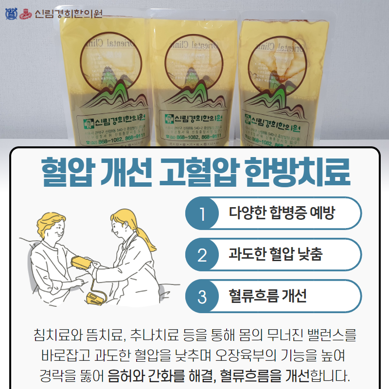특히 고혈압으로 인해 간 열감이 심하게 오르기도 하고 음험하고 쌓인 체내 노폐물이 문제를 일으키기도 합니다.이에 대한 불편함도 신림 경희한의원을 통해 해결할 수 있습니다.