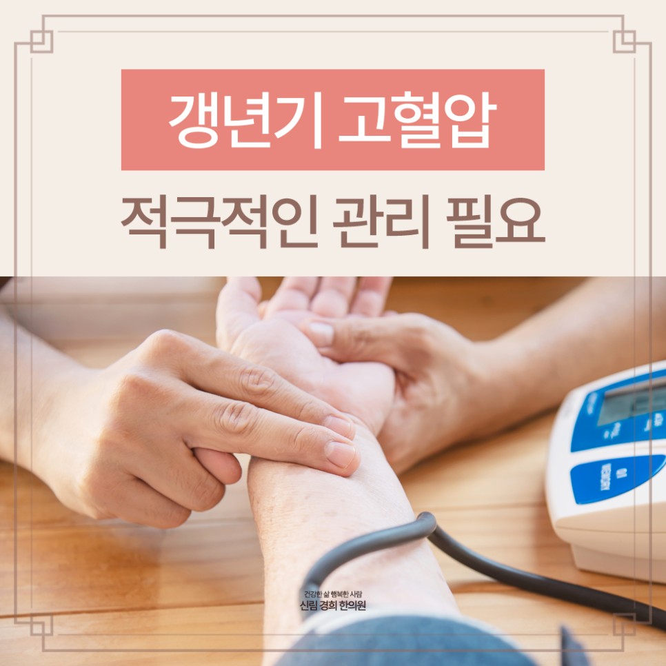 갱년기에는 시기의 차이는 있지만 남녀 모두 나타나는 자연스러운 현상입니다.혈압이 높은 상황을 방치하면 고혈압에 따른 합병증이 발생할 수 있으므로 고혈압을 예방하기 위해 또는 치료를 위해 신림경희한의원을 부담없이 방문하시기 바랍니다.