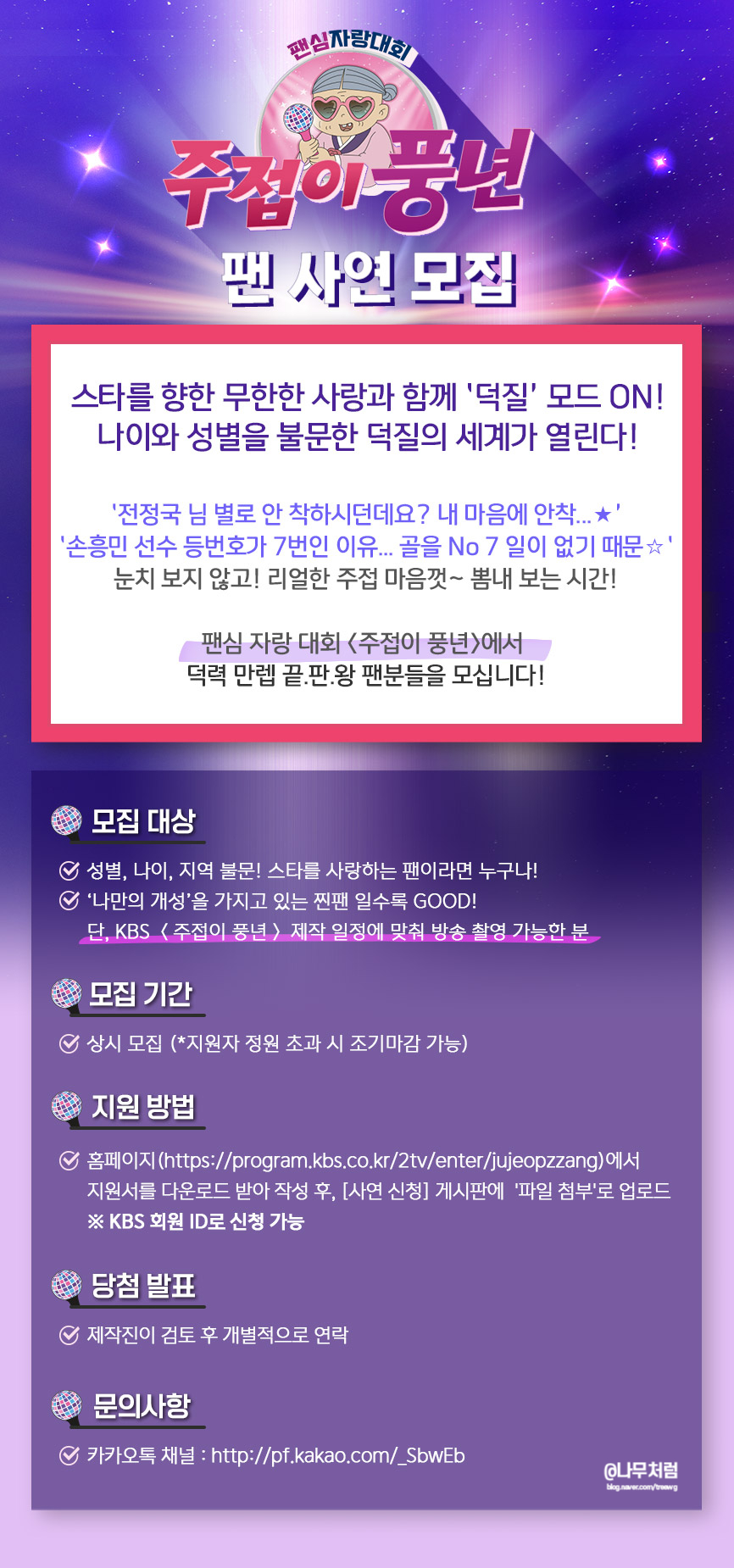 목요일 예능 KBS 추접이 풍년, 송가인 임영웅 BTS가 온다!(ft. 출연진 공식 영상) kbs가 목요일 예능에서 참신한 프로그램을 선보인다. 이름 붙여 추접이 풍년이라는 제목이다.타이틀도 강하다.풀네임의 제목은 팬심자랑대회 추접이 풍년이다. 제목 그대로가 프로그램 내용이기도 하다.나이와 성별에 관계없이 좋아하는 스타를 오타 활동하는 팬들의 이야기를 다룬다.오타활은 어떤 분야 혹은 사람을 열정적으로 좋아하고 그와 관련된 것을 모으거나 파고드는 것을 의미한다.추첩이 풍년편성: KBS2 오픈: 2022년 1월 20일 방송시간: 매주 목요일 예능 저녁 9시 30분 출연진: 이태곤, 박미선, 장민호 추첩이 풍년 기본 정보 한마디로 소개하자면 스타오타 활동의 최신 트렌드 추첩! ‘추첩’에 나이 제한이 있나요?추첩단과 함께 덕후 활동을 탐구하는 ‘덕행덕’ 토크 예능 프로그램이다.