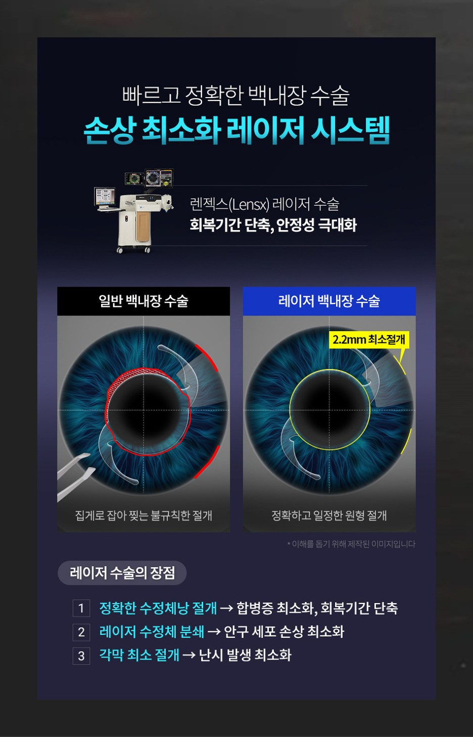 앞서 봤던 3단계의 섬세한 과정과 함께 안구 손상을 최소화할 수 있는 레이저 시스템까지 도입해 더욱 안전하게 지원했습니다.