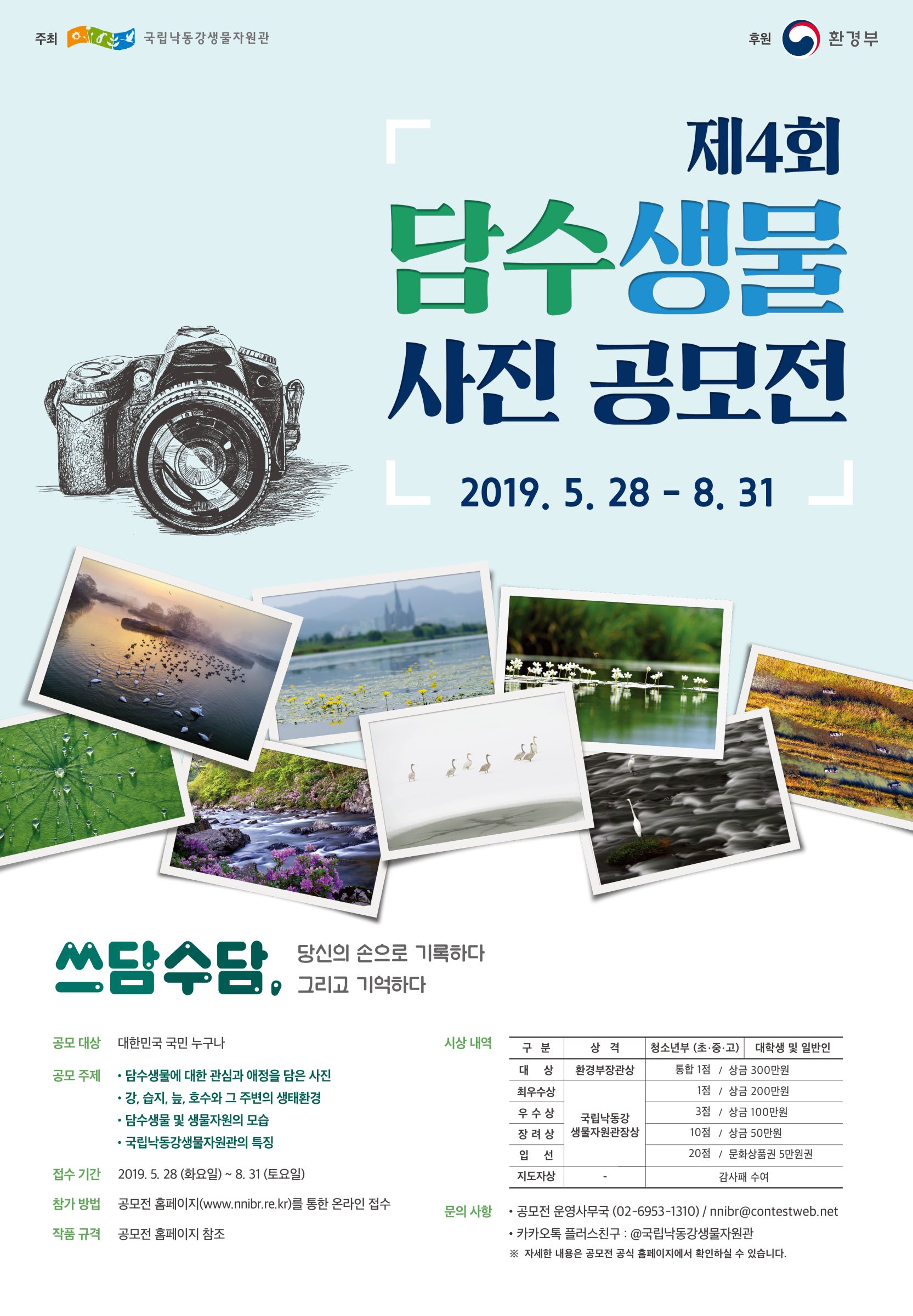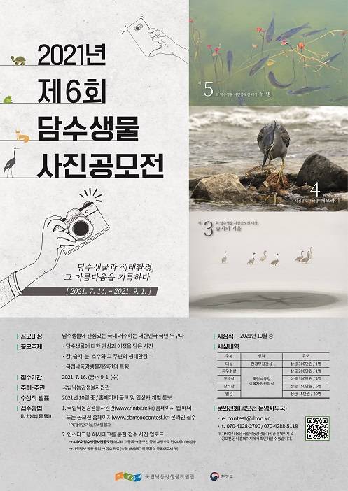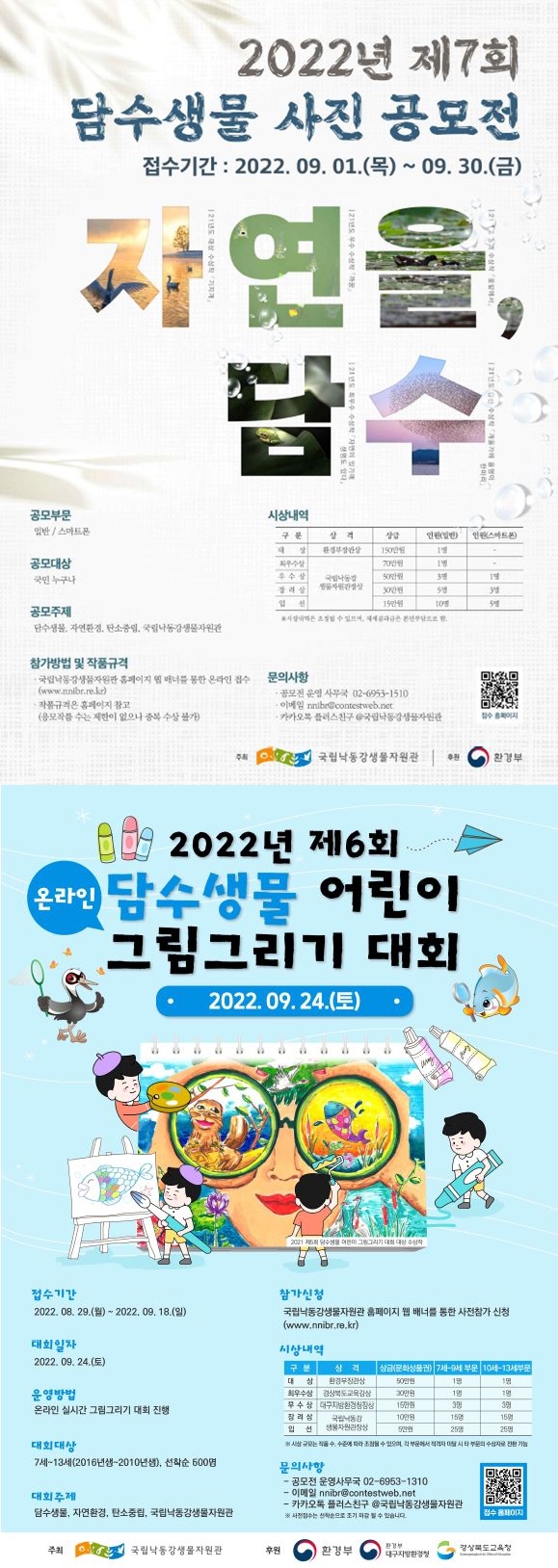 경기도 일산호수공원에 잉어떼가 한가롭게 놀고 있고 자연에는 멋진 생물들이 살고 있습니다.우수상_ 오건호 / 호수친구수생에서 자라는 수초와 이슬을 머금은 연잎이 만들어낸 환상적인 느낌의 연못 풍경입니다. 장려상장려상_김정미/데칼코마니,장려상_임광엽/매미휴식장려상_김정미/데칼코마니,장려상_임광엽/매미휴식장려상_임지향/홍신지이야기,장려상_하정규/물고기길장려상_임지향/홍신지이야기,장려상_하정규/물고기길장려상_현동철/유유자적2022 담수생물사진 공모전 수상작(스마트폰 부문)우수상우수상_이수영/꽉 잡아주세요경기도 군포시 조막골생태공원 개구리가 연잎을 꼭 쥐고 있습니다. 장려상장려상_권영동/수로공원,장려상_김소현/연못위발자국장려상_권영동/수로공원,장려상_김소현/연못위발자국장려상_신성호/은색백로, 장려상_하두철/대청호 가뭄 수상작은 국립낙동강생물자원관 홈페이지와 생물누리관 카페에서도 감상할 수 있습니다. ▼홈페이지 바로가기▼수상작 수상작 | 국립낙동강생물자원관 www.nnibr.re.kr수상하신 분들 다시 한번 축하드립니다!담수생물사진 공모전 자연을 담수에 참여하여 관심 가져주신 여러분께도 진심으로 감사드립니다.그럼 다음에 또 만나요.바이바이!역대 수상작을 보러 가다[자원관에서] 2021 담수생물 사진·그림 수상작 ‘한눈에’ 안녕하세요~ 댐입니다 🙂 7월부터 9월까지 진행한 담수생물 사진 공모전과 그림그리기 대회를… blog.naver.com[자원관에서] 2021 담수생물 사진·그림 수상작 ‘한눈에’ 안녕하세요~ 댐입니다 🙂 7월부터 9월까지 진행한 담수생물 사진 공모전과 그림그리기 대회를… blog.naver.com[뉴스] 2019 담수생물 사진 공모전 수상작을 만나보세요.안녕하세요~ 국립낙동강생물자원관 블로그 번 댐입니다! 9월 27일 2019 담수생물 사진 공모전 시상…blog.naver.com[뉴스] 2019 담수생물 사진 공모전 수상작을 만나보세요.안녕하세요~ 국립낙동강생물자원관 블로그 번 댐입니다! 9월 27일 2019 담수생물 사진 공모전 시상…blog.naver.com[공지] 2020 담수생물사진 공모전 수상작 발표! 안녕하세요~ 국립낙동강생물자원관 블로그 차례 댐입니다! 7월 열린 2020 담수생물 사진 공모전 blog.naver.com[공지] 2020 담수생물사진 공모전 수상작 발표! 안녕하세요~ 국립낙동강생물자원관 블로그 차례 댐입니다! 7월 열린 2020 담수생물 사진 공모전 blog.naver.com[공지] 2020 담수생물사진 공모전 수상작 발표! 안녕하세요~ 국립낙동강생물자원관 블로그 차례 댐입니다! 7월 열린 2020 담수생물 사진 공모전 blog.naver.com[공지] 2020 담수생물사진 공모전 수상작 발표! 안녕하세요~ 국립낙동강생물자원관 블로그 차례 댐입니다! 7월 열린 2020 담수생물 사진 공모전 blog.naver.com[공지] 2020 담수생물사진 공모전 수상작 발표! 안녕하세요~ 국립낙동강생물자원관 블로그 차례 댐입니다! 7월 열린 2020 담수생물 사진 공모전 blog.naver.com