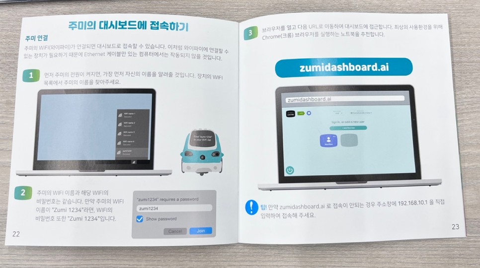 설명서에는 주미를 조립하는 방법과 인터넷 접속 방법이 그림과 함께 자세히 설명되어 있습니다.