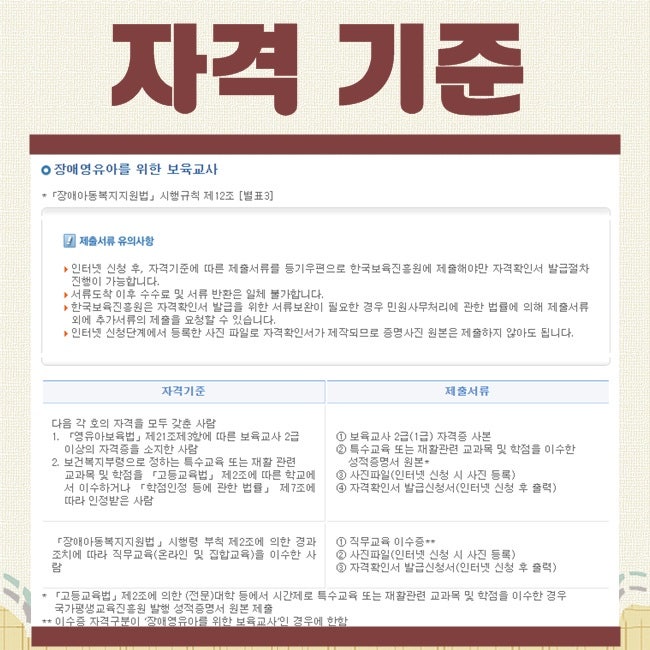 이번 시간에 소개해드릴 콘텐츠는 장애 영유아 보육교사의 자격 취득 방법에 대해서입니다.
