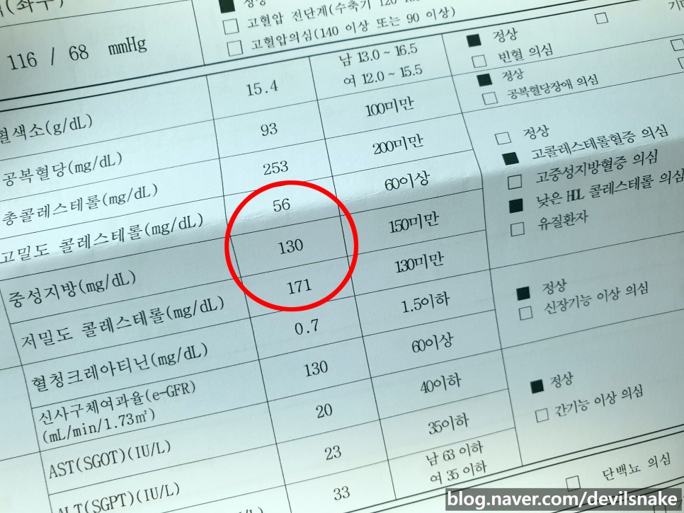 고밀도콜레스테롤(HDL)은 수치가 높을수록 좋습니다.60이 넘어야 되는데 저는 56이 나왔어요.저밀도콜레스테롤(LDL)은 수치가 낮을수록 좋은 것으로 저는 171에서 이상지혈증 의심 판정을 받았습니다.총 콜레스테롤 수치가 253이지만 200 미만으로 정상이라고 합니다.