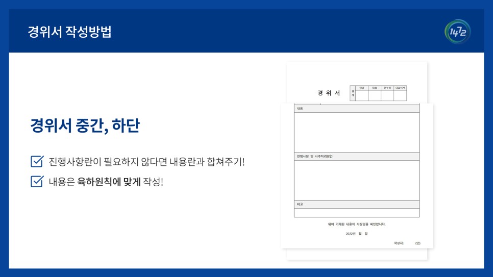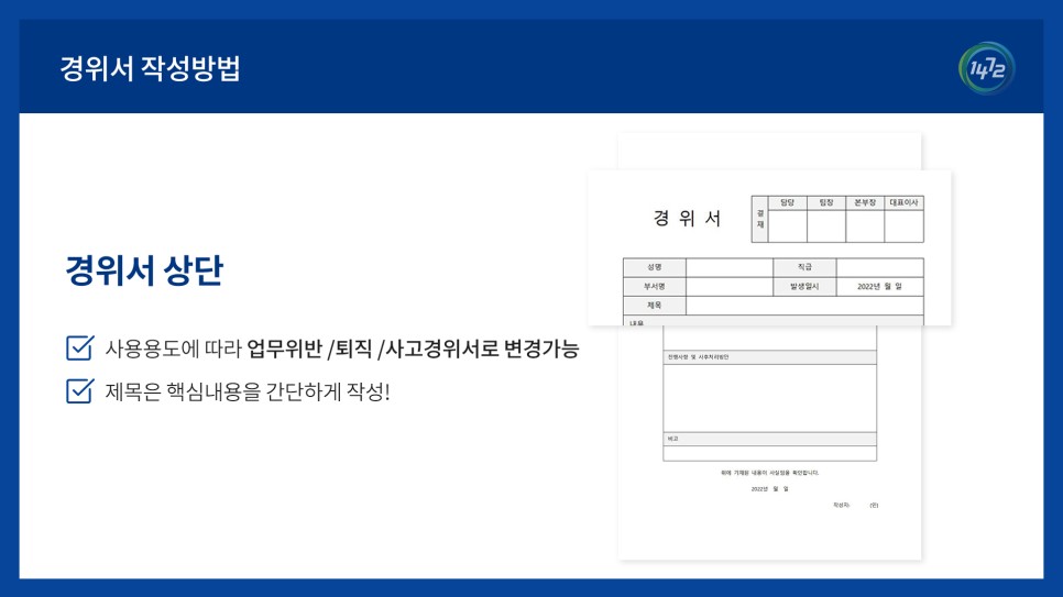 먼저 상단에는 결재선 서명란과 문서 제목이 있습니다.사용 용도에 따라 업무 위반 / 퇴직 / 사고 경위서로 변경하여 사용하셔도 됩니다. 나머지 틀은 필요한 양식에 맞게 수정해주세요.^^)