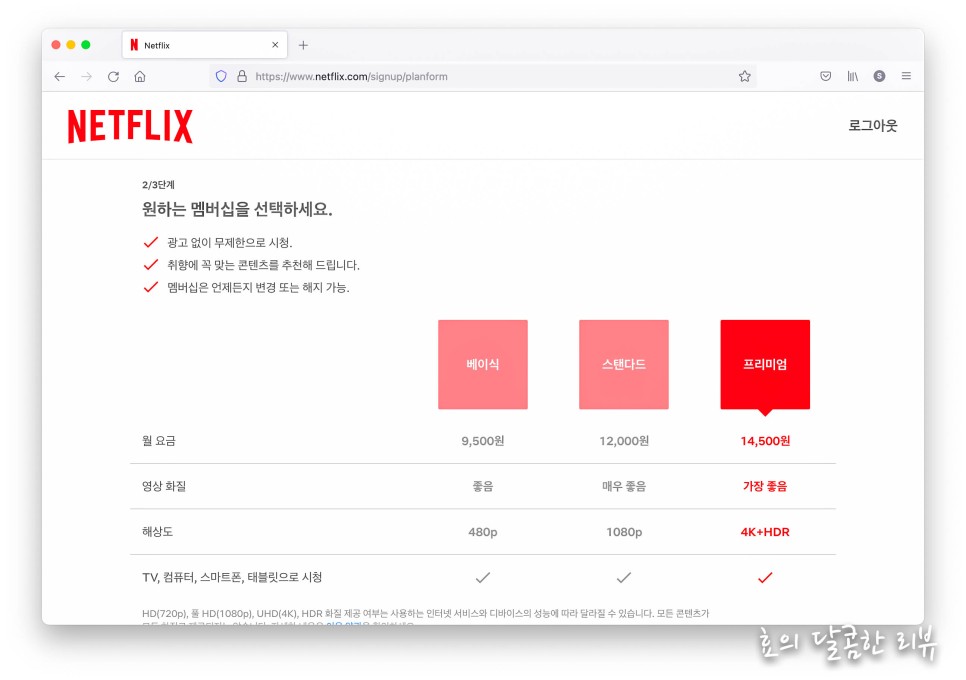 원하는 멤버십을 선택합시다.3개의 요금제 모두 TV, 컴퓨터, 스마트폰, 태블릿으로 시청할 수 있지만 동시 접속과 해상도는 각각 다릅니다.