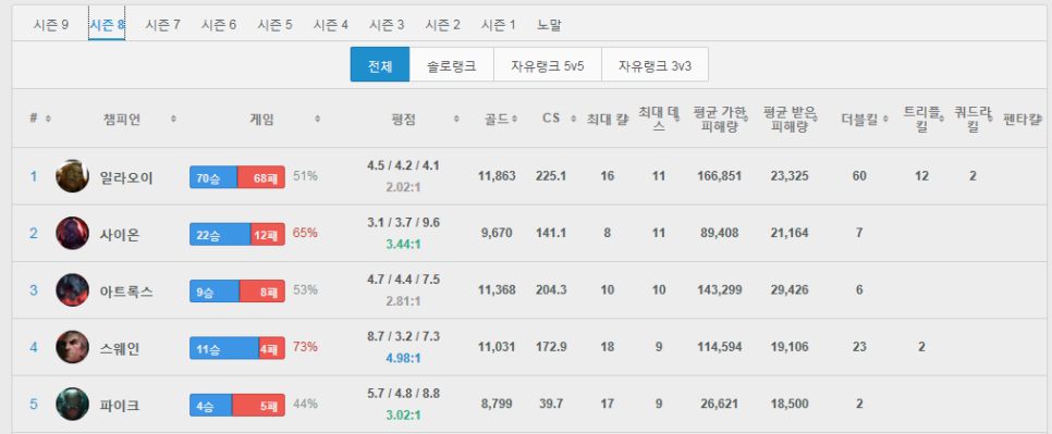 이제 남은건 숙련도 포인트 84만 6천..아무리 다른 챔피언이라도 숙련도 1위가 변하지 않아