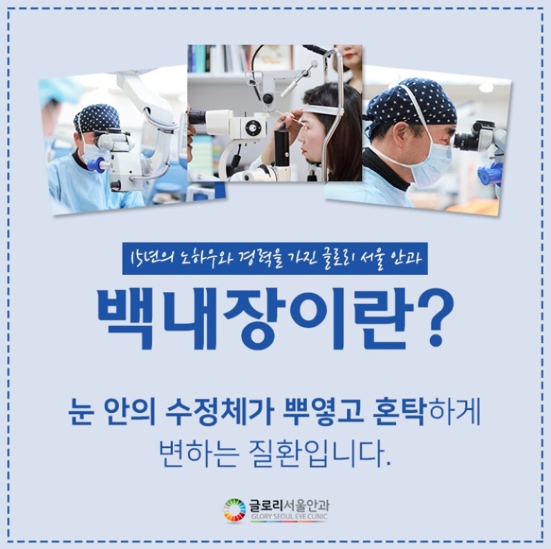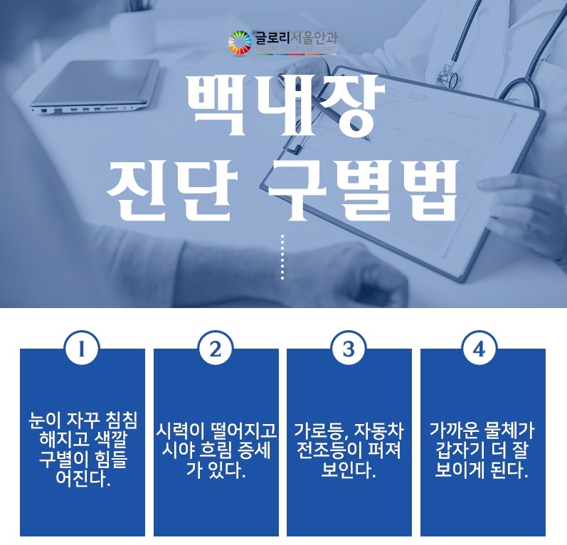 나이가 듦에 따라 눈이 침침하여 색의 구별이 어려워지거나 시력이 저하되는 느낌이 든다면 안과의 정밀 검진을 받는 것이 좋습니다. 대개는 단순 노안이라고 생각합니다만, 백내장을 알리는 신호이기 때문입니다.발병 초기에는 별다른 자각증상이 없어 빠른 진단이 어려울 수 있으나 병이 진행되면 눈부심, 눈부심, 사물이 겹쳐 보이는 복시증상, 낮보다 밤에 잘 보이는 주맹증상 등 다양한 시력장애가 동반됩니다. 이러한 증상이 있음에도 불구하고 진료를 받지 않고 증상을 오래 방치할 경우 녹내장이나 안내염 등 심각한 합병증을 유발할 수 있고 실명의 위험성도 높아지기 때문에 무엇보다 신속한 진단과 치료를 받는 것이 중요합니다.