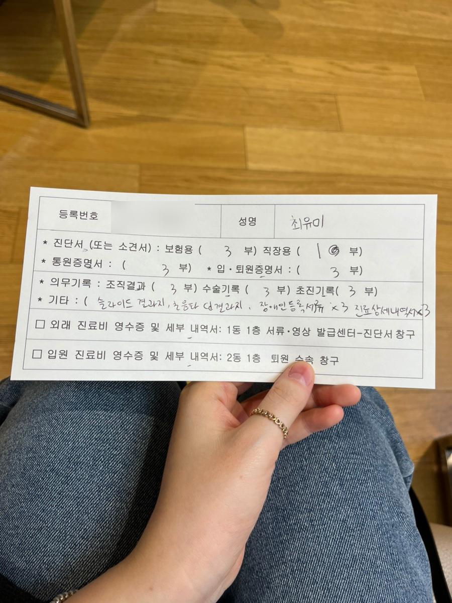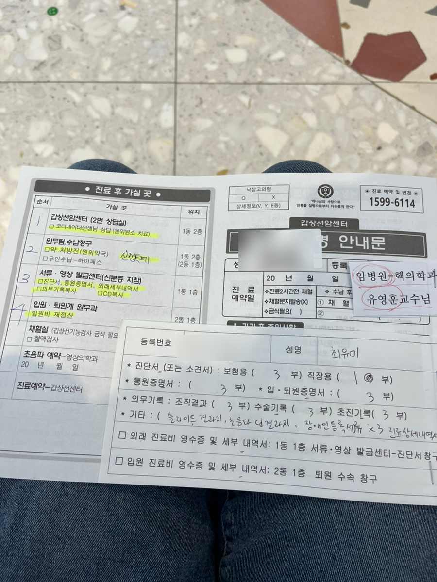 진료시간이 거의 지나고 갑상선암센터 로비에서 기다리며 보험청구가 필요한 서류도 체크된 날은 진료보다 보험용 서류를 마련하기가 너무 바빠 집에 가자마자 늘린다.