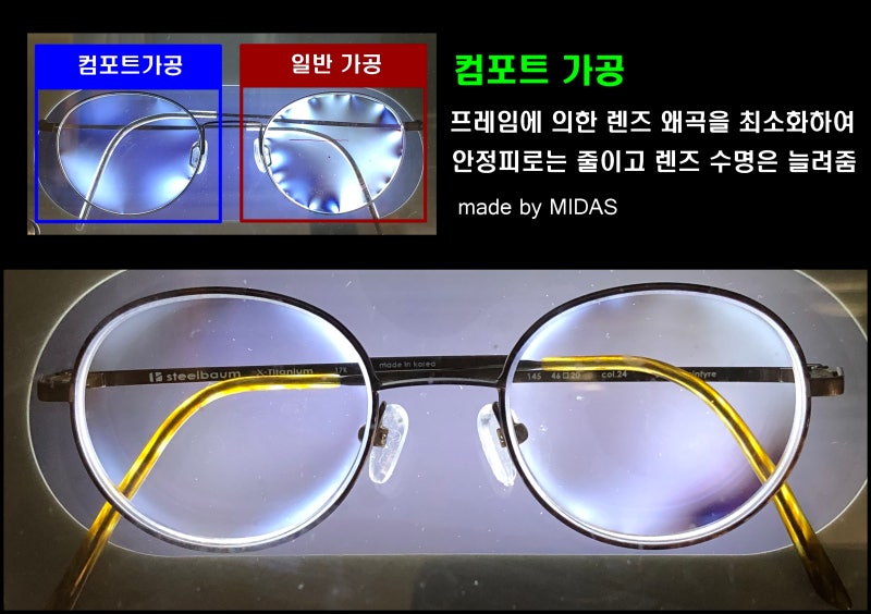 오른쪽은 도수가 없고 왼쪽은 +14D 초고도 원시도수가 있는데 측면에서 봤을 때는 차이가 거의 없도록 깔끔하게 제작 완료했어요 😀