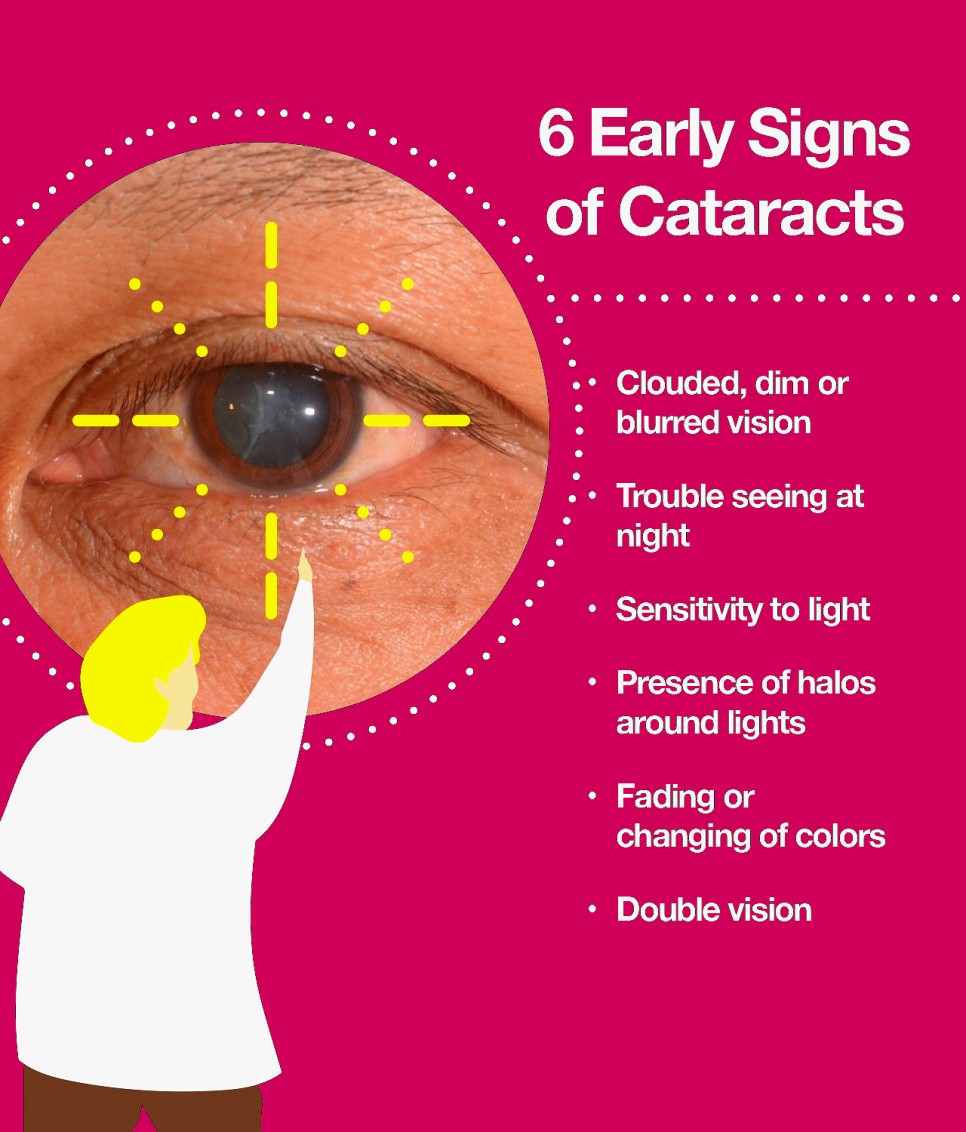 백내장(Cataract) 초기 증상과 원인, 치료1.초기 증상으로는 대개 ①시력 저하 ②사물이 흐릿하거나 일그러져 보인다 ③실내 조명 등 어떤 빛에 특별히 반응하는 눈부심 ④물체의 외곽선이 두 개로 보인다 ⑤초기에 근시인 사람은 안경 없이도 책이나 신문 등이 잘 보이기도 하고 시력이 좋아졌다고 착각하기도 한다 ⑥물체의 색이 특히 노랗게 보인다 »심하게는 것을 들 수 있습니다.