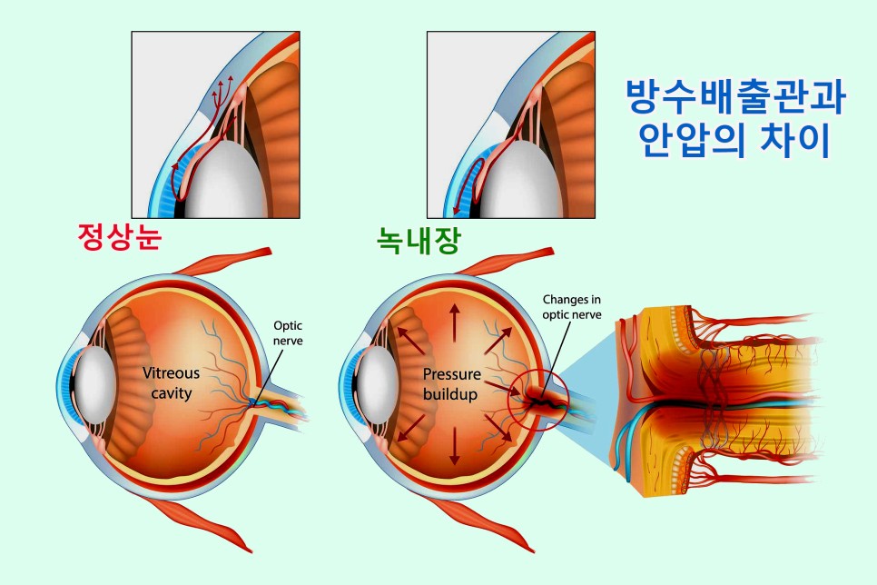 녹내장(Glaucoma) 초기 증상과 원인, 치료 1. 사람의 안구 구속에는 방수(수양액; 투명한 액체)가 있어 안구 내부를 돌며 영양 공급을 하고 배출관을 통해 빠져나와 혈액으로 흡수되어야 하는데. 제대로 벗어나지 못하면 안압이 올라 시신경을 손상시킵니다. 그러한 시신경 손상은 매우 서서히 진행되기 때문에 초기에는 증상을 느끼지 못하고 ① 안압상승 ② 안구통 ③ 시력저하 ④ 두통 ⑤ 충혈 ⑥ 심하면 구토 등을 하게 됩니다. ⑦선천적인 아기의 경우는 너무 눈물도 머금고 이상한 감촉, 눈동자 떨림 등이 일어날 수 있대요!