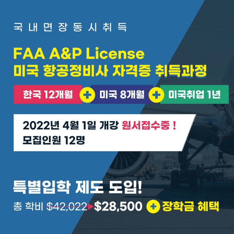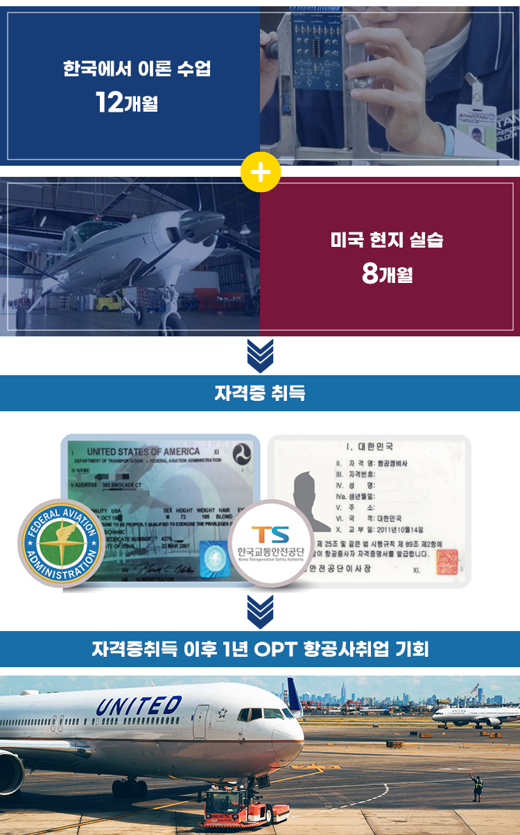 3. FAAA & P 미국항공자격과정 – Hybrid 온라인 + 오프라인 교육으로 미국 FAA자격취득 가능 ☞ 한국에서 온라인 12개월을 한 후 + 미국에서 8개월 실습과정 = 20개월[자격]