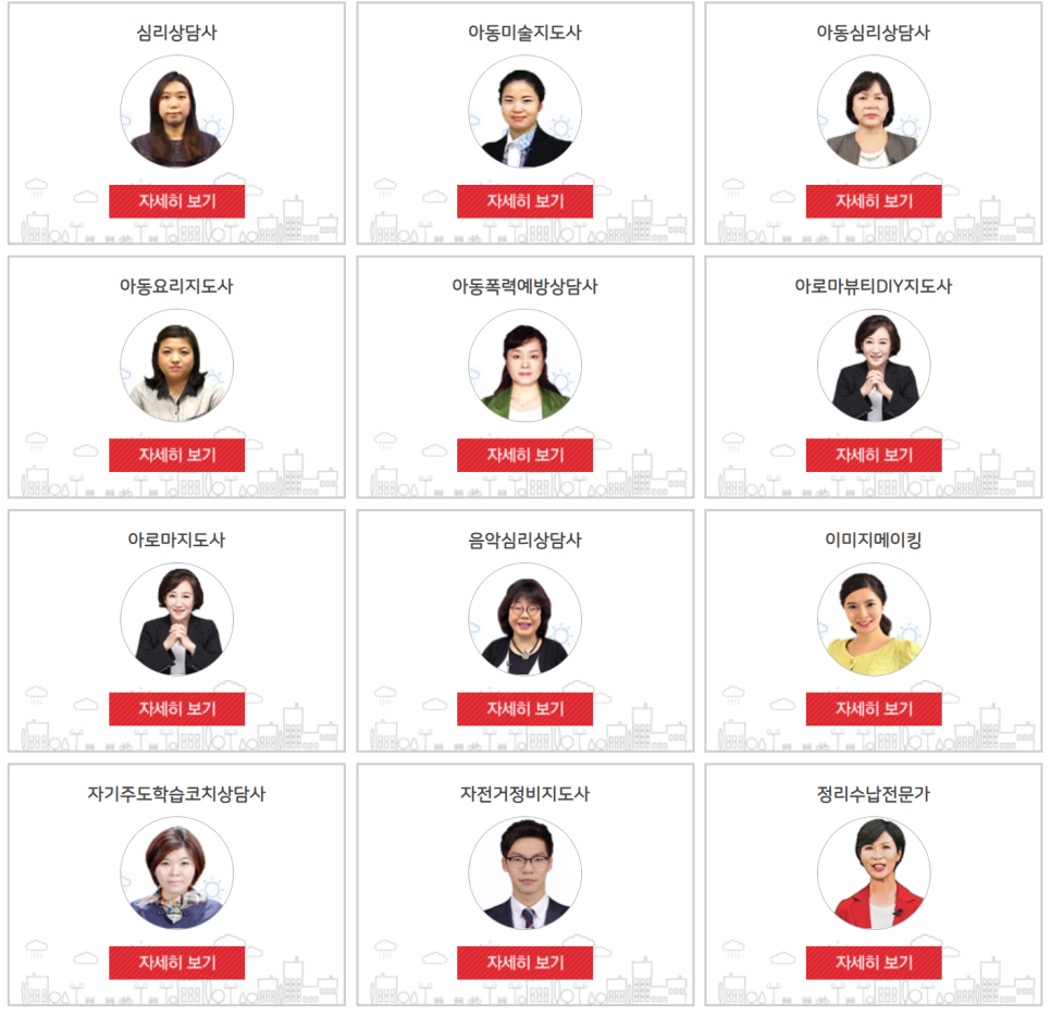 과정은 무려 56개 과정! 독서지도사, 독서논술지도사, 심리상담사, 코딩지도사, 마케팅기획전문가 등 다양한 자격증 취득을 위한 강의가 마련되어 있습니다!