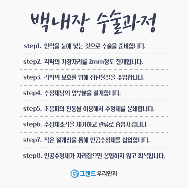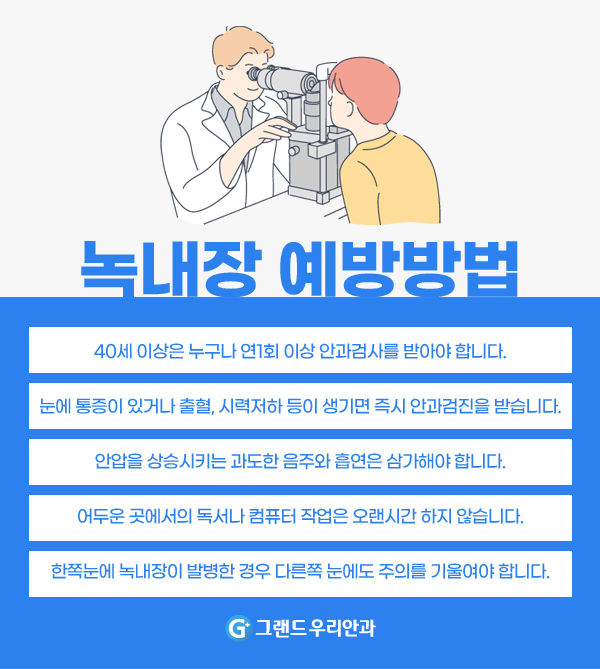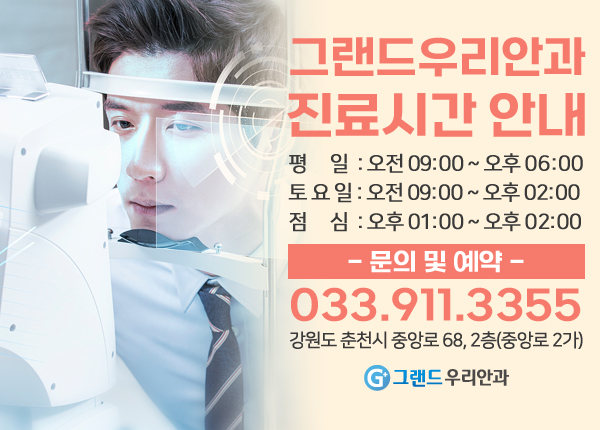 이러한 안구질환을 예방하기 위해서는 40세 이상이면 정기적으로 그랜드 안과를 방문하여 안구검사를 받는 것이 좋으며, 음주나 흡연은 증상을 더욱 심하게 할 수 있으므로 가급적 삼가야 합니다. 본원은 평일에 시간이 없는 현대인을 위해 토요일도 진료를 실시하고 있사오니, 내점 부탁드리며, 자세한 내용은 아래 배너에서 확인하시기 바랍니다.