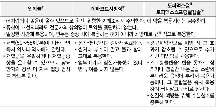 - – 트립탄류의 약은 전조증상이 있거나 무전조라도 두통이 생기기 시작하면 일종의 황금시간대가 있으므로 두통을 참지 말고 약을 바로 복용하는 것이 좋다.따라서 비상약 개념으로 항상 지니고 다녀야 한다.가방이나 안주머니에 한두 번 복용할 수 있는 여분의 약을 항상 넣어두는 것이 좋다.