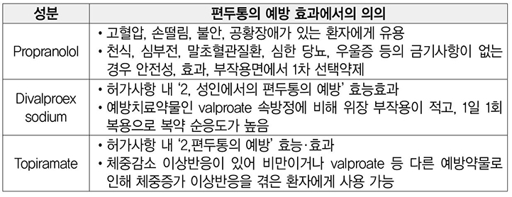 - 2021년 11월 기준 FDA(미 식품의약국)에서 편두통 예방치료에서 approved 한 성분은 propranol, topiramate, div alproex, timol, atogepant, rimegepant로 총 6가지인데, 내 안에서 한국에서 사용 가능한 성분은 표에 굵게 Bold 표시한 3가지 뿐이다. (Timolol은 한국에서는 녹내장에 안압 낮추는 안약으로 써서 제외하고 나머지 2개는 신약으로 아직 들어오지 않는다. methysergide는 부작용 문제로 퇴출.)