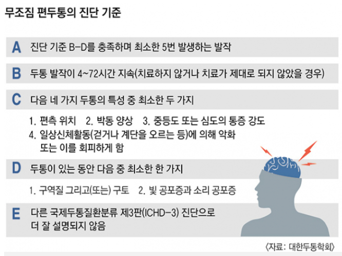 사진 출처:아는 사람만 아는 고통 편두통과 조짐현상(마이니치신문)에 대한 국제두통학회(IHS)의 무조사 편두통 진단기준은 이렇다.편두통의 원인