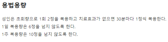 처음 한 번에 750mg(3알) => 30분 후에도 가라앉지 않으면 1~2알 추가 복용(1일 최대 5알)하도록 되어 있으나 일할 때는 위장의 부작용 때문에 2알만 복용하도록 하는 경우도 많다. (cf. 아나프록스와 같은 정제(정제) 형태의 Naproxensodium 제품은 1알 275mg 나노알로 표기된 제품.