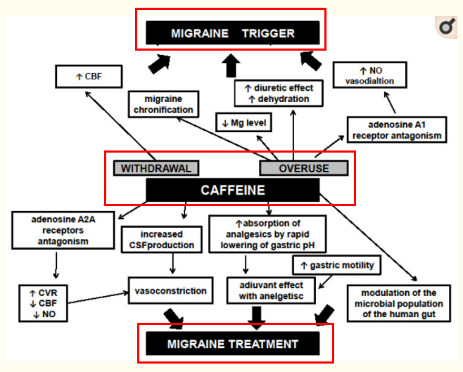 출처 : The Ambiguous Role of Caffeine in Migraine Headache : From Trigger to Treatment (Nutrient, 2020 Aug) 카페인의 상습적 복용은 편두통의 발생 빈도를 높이는 원인이 된다는 점에 주의!! = 즉, 막상 약을 먹을 때 조금은 잘 들어도 상습적으로 재발하는 편두통 환자들은 저 약을 잘 먹지 못하는 상황.