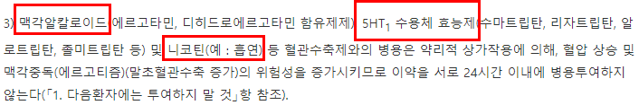 - 3) 맥각알칼로이드: 아래의 적을 크래밍정과 트립탄 계열 약(+흡연)은 함께 복용하면 심혈관계 부작용 위험이 증가(과도한 혈관 수축)하여 최소 24시간 이상 간격을 두고 복용해야 합니다.(함께 처방받을 경우 DUR를 뜯어서 거르지만 집에 예전 약이 있으면 함께 먹을 경우 놓칠 수 있으니 주의!!)