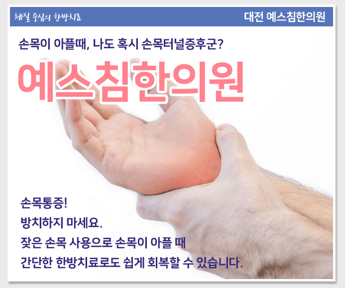 손목 통증이 처음 발생했을 때는 비수술적인 치료로 충분히 회복할 수 있어요대전한의원 예스침한의원은 정직한 진료를 통해 항상 연구하며 최적의 치료방법을 통해 환자들의 빠른 회복을 돕습니다.