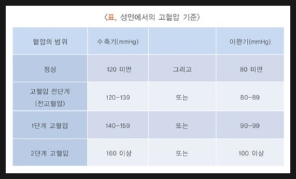 구분수축기혈압(mmHg) 이완기혈압(mmHg) 정상혈압 <120<80 고혈압 전단계 120~13980~89 고혈압 1단계 140~15990~99 고혈압 2단계 160100