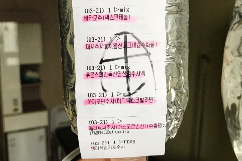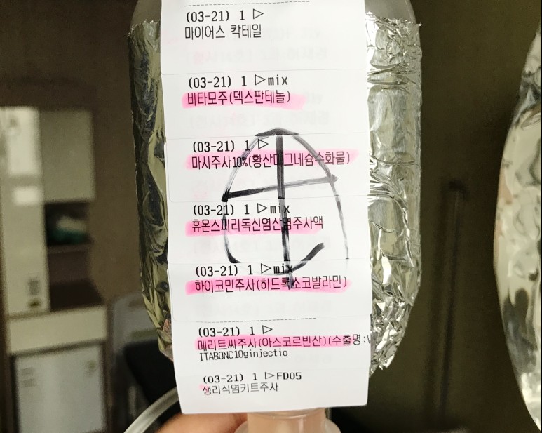 어제 원장 회진을 오셨을 때 퇴원 전에 영양제를 받고 싶다고 말씀 드렸습니다.마늘주사, 비타민주사등 종류도 너무 많고 몸 상태에 따라서 필요한 영양도 다르지만 의사선생님께서 제 몸 상태를 잘 아실것 같으니까 처방해 주신대요.