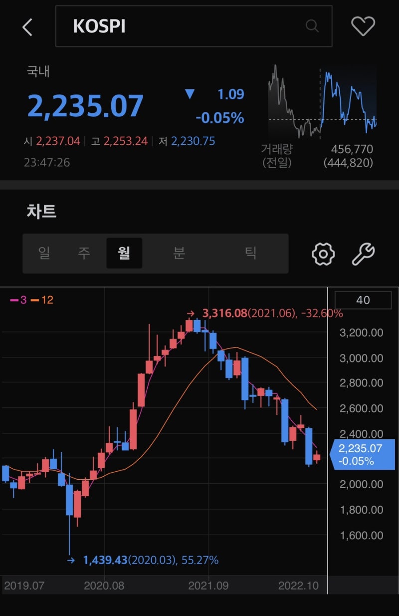 코스피지수 월봉차트 골든크로스와 데드크로스 고점 대비 30% 하락한 코스피지수(출처:미래에셋증권)