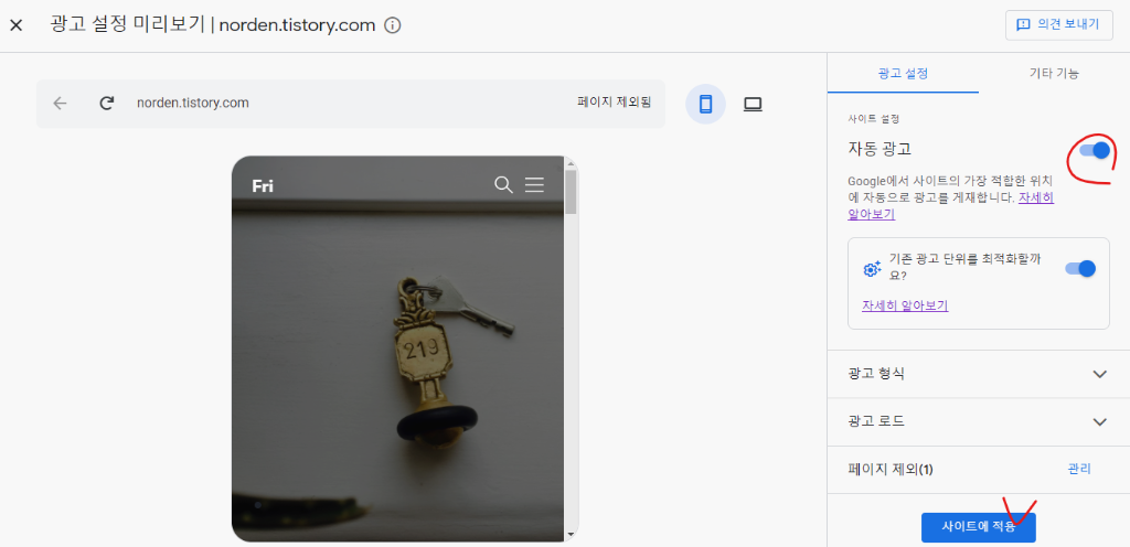 T-StoryAdSense 자동 광고 – 액티브 버튼이 꺼지면 켜주세요.- 아래 기존 광고 단위 최적화 해드릴까요? 라는 문구 옆에 있는 활성화 버튼도 활성화시킵니다.여기서 기존의 T스토리 블로그를 운영하면서 html를 통해 애드센스 광고의 위치를 정해주신 분들은 활성화시키지 말아주세요.기존에 설정되어 있던 광고 위치가 변경될 수 있습니다.
