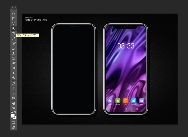 먼저 도구를 제대로 보여줄 수 있는 사진인 스마트폰 사진에서 예를 들어봅시다!위의 사진과 같이 자동선택도구를 눌러 자신이 원하는 부위와 색상을 선택하여 지울 수 있다는 점! 바로가기 키는 w키이고 자동선택도구로 검정색 바탕부분을 지워주는 거예요.