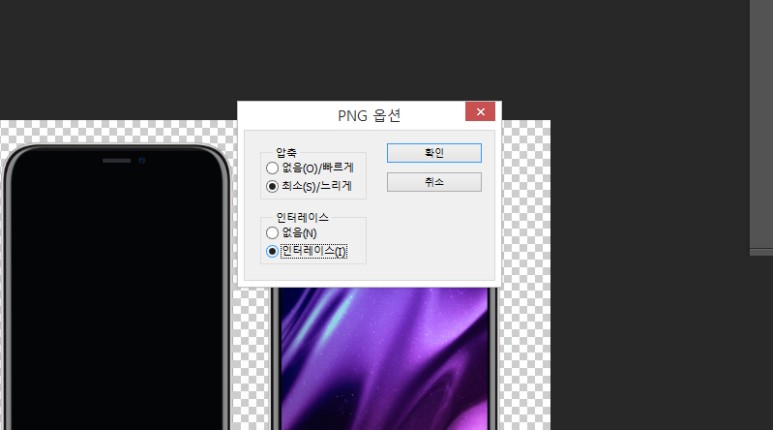 저장후 png옵션이 나옵니다~! 배경을 날리려면 인터레이스를 없이 선택하셔서 꼭 저장해주세요~!