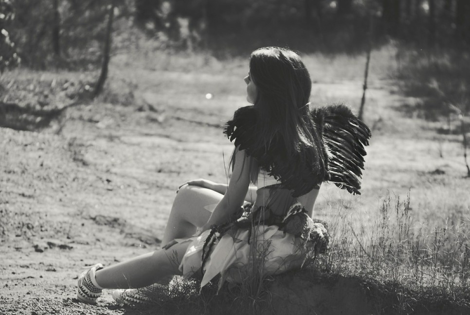 코스튬 의상을 입은 여성 옆얼굴 사진입니다.흑백사진으로 무거운 분위기와 함께 슬픔이 느껴지는 것 같아요.