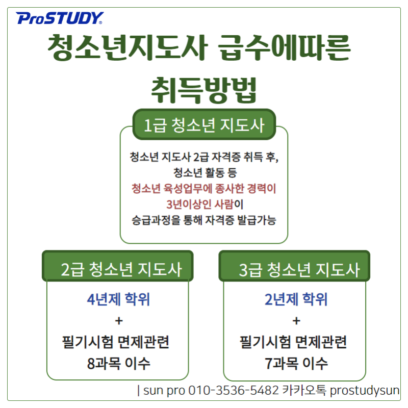 먼저 청소년지도사의 자격은 1급, 2급, 3급 이렇게 세 종류로 나누어져 있습니다. ^^그 중에서 1급은 2급을 취득하고 그 다음에 경력을 쌓아야 하기 때문에 바로 취득하기 힘들겠지만 나머지 청소년지도사 2급이나 그 다음 청소년지도사 3급의 경우 조금 더 쉽게 취득할 수 있습니다! 🙂 청소년지도사 2급 필기면제 = 4년제 졸업학력 + 전공 8과목 청소년지도사 3급 필기면제 = 전문대 졸업학력 + 전공 7과목처럼 전문대 또는 4년제 대학 졸업학력을 가지고 있는 경우 전공만 이수하면 필기면제를 받을 수 있습니다! 게다가 학점은행제를 활용하면 비전공자도 보다 쉽게 준비하여 그만큼 원하던 자격증을 취득합니다. ^^