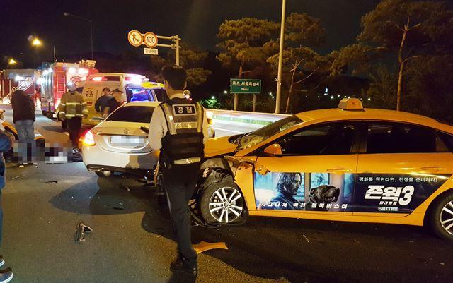 배우 한지성씨가 숨진 2019년 5월 6일 오전 3시 52분쯤 인천국제공항고속도로 서울방향 김포공항나들목 인근 교통사고 현장에서 경찰이 조사를 하고 있다. 인천소방본부 제공