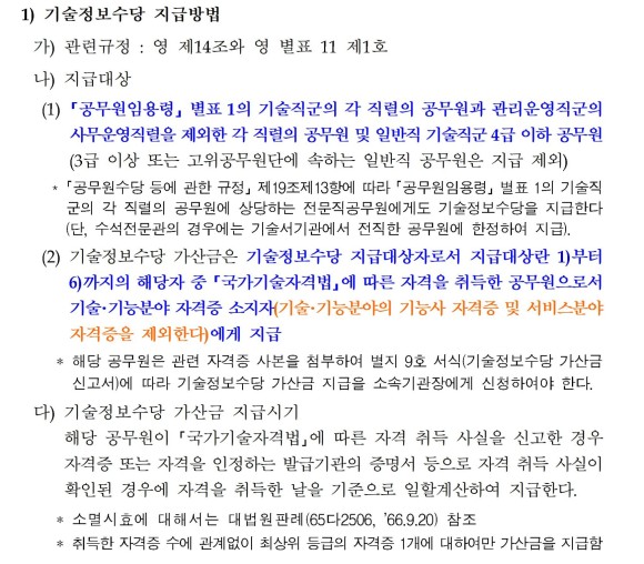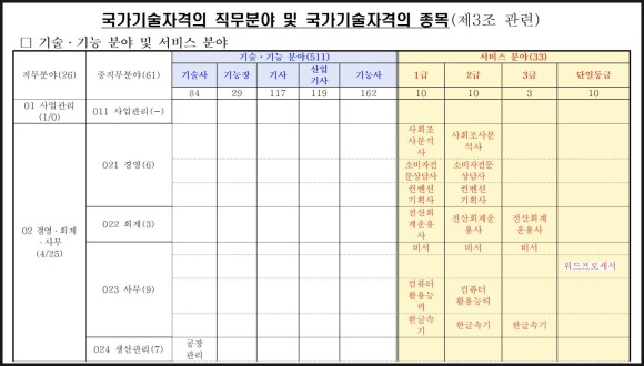 “왜냐하면 기술정보수당 가산금의 지급대상이 되지 않는 서비스분야 자격증은 1~3급 내지 단일 등급으로 구성되어 있기 때문에 기술사, 기능장, 기사, 산업기사로 분류되는 자격증은 모두 기술, 기능분야이기 때문입니다”