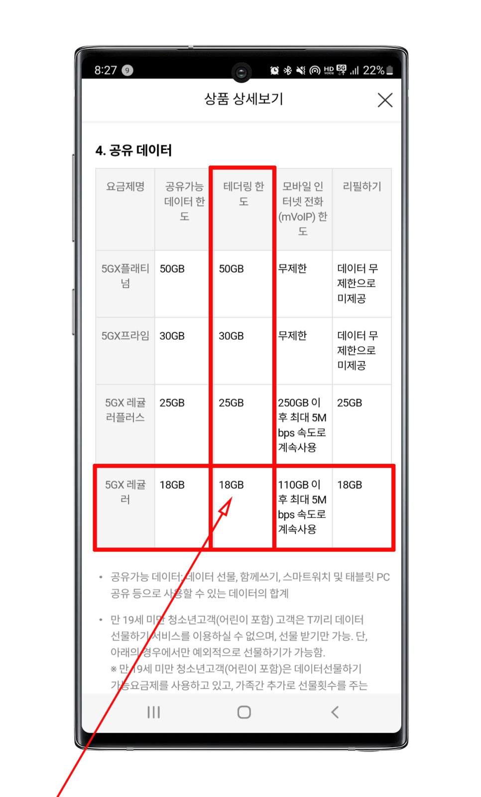 문제 해결을 위해 인터넷을 찾아 검색해보니 올해 1월부터 테더링 데이터 제한이 본격화되고 해당 요금제별로 제공되는 데이터를 모두 사용하게 되면 차단된다는 사실을 알게 된 겁니다. 제가 가입한 5GX 레귤러 요금제를 다시 살펴보니 테더링 한도가 18GB더군요. 게다가 데이터 완전 무제한 5GX 플래티넘 요금제 50GB 한도 제한이 있었습니다. 왜 저는 지금까지 이 내용을 몰랐을까요? 하하하..