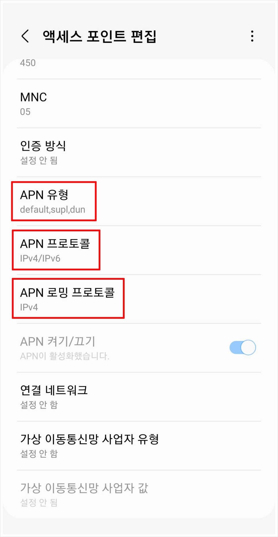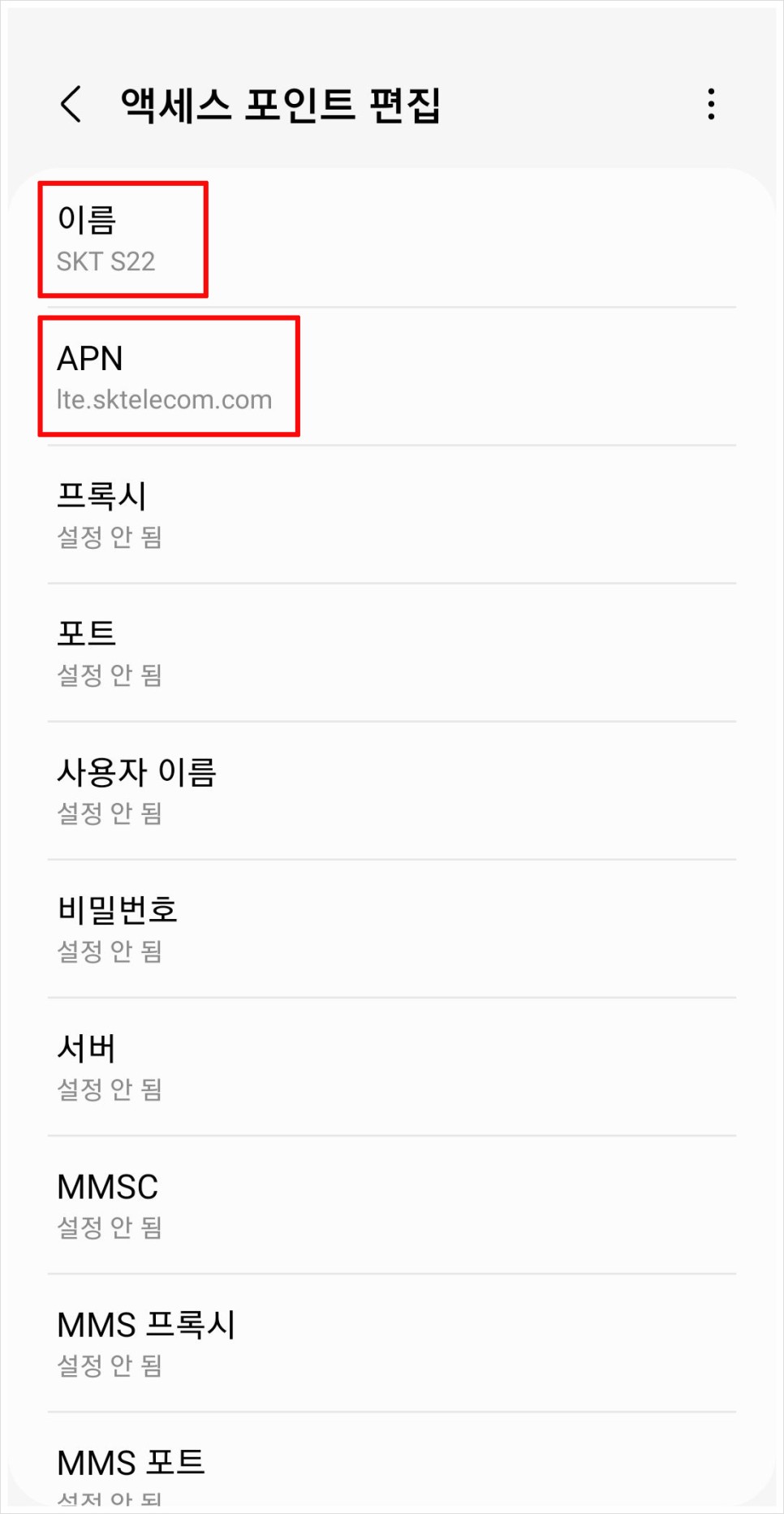 액세스 포인트 편집에서는, 이름, APN, APN 타입, APN 프로토콜, APN 로밍 프로토콜의 정보값만을 입력하십시오. 상기 캡쳐된 화면대로 동일하게 입력해주세요.