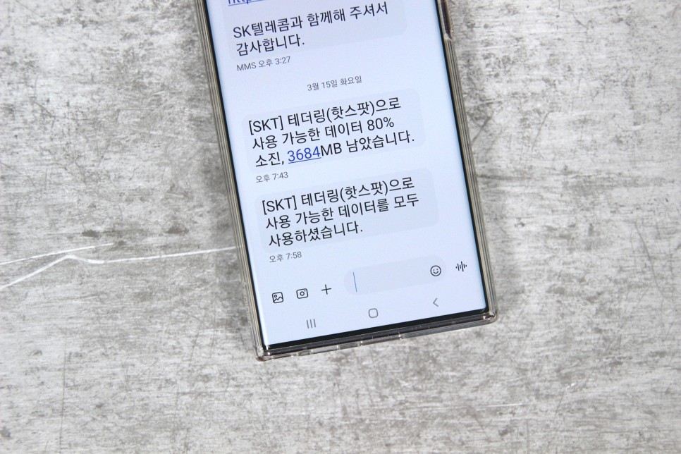 이번에 갤럭시S22 울트라에서 스마트폰 기기변경을 해서 자주 사용해왔습니다. 평소처럼 노트북으로 작업하기 위해 핫스팟으로 연결하여 인터넷 작업을 하고 있었습니다. 그런데 갑자기 SKT에서 한 통의 메시지가 왔습니다. 테더링(핫스팟)에서사용가능한데이터80%가소진,3684MB남았습니다. 지금까지 테더링(핫스팟) 데이터를 쓰면서 이런 문자를 받은 기억이 없는데 갑자기 이 문자가 왔어요. 저는 이 내용을 읽고 대수롭지 않게 생각하고 그냥 무시해버렸어요.
