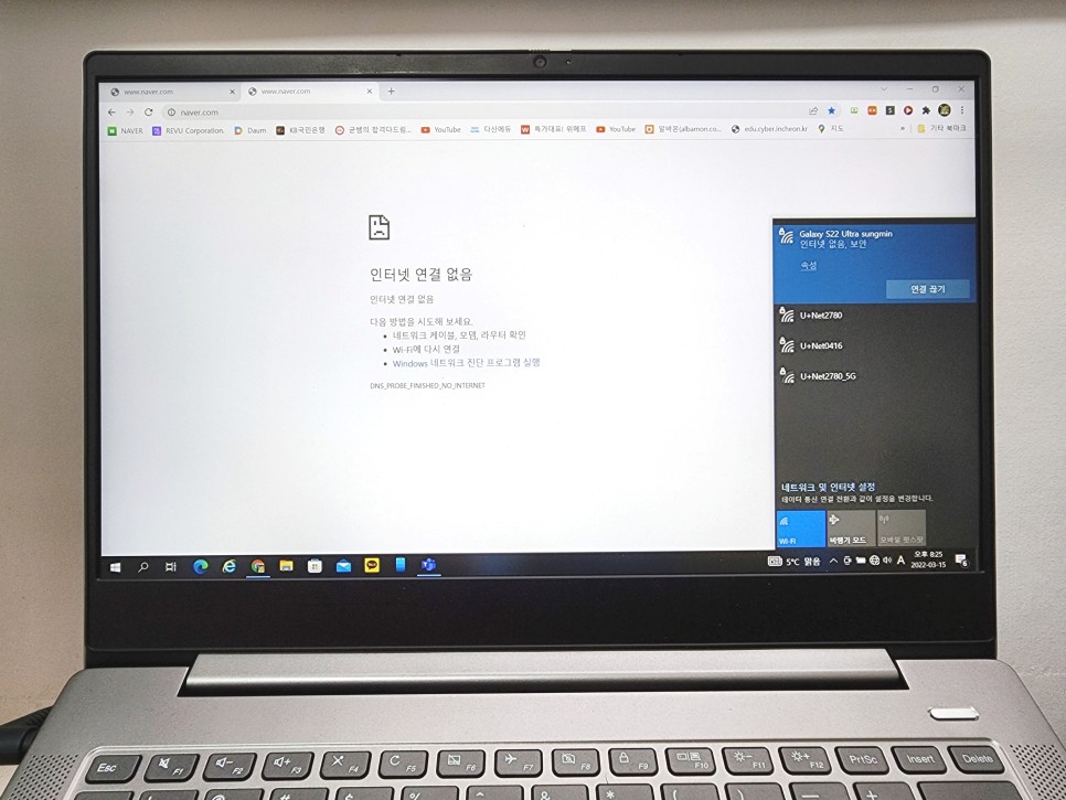 잠시 후 노트북으로 열심히 인터넷 작업을 하던 상황이었는데 인터넷 접속 없음이라는 문구가 나와 인터넷이 불통이 되고 말았습니다. 처음에는 너무 당황해서 스마트폰에 문제가 있나 싶어서 이것저것 방법을 다 찾아봤는데 스마트폰 자체적으로는 인터넷이 잘 돼서 문제가 없어 보였습니다. 그런데 신기하게도 테더링 핫스팟 뿐만이 아니었습니다.