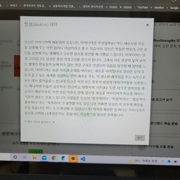 최근 진로에 대해 진지하게 고민하면서 내가 잘하는 게 뭘까?라고 생각하는 경우가 많아졌고 자연스럽게 자기계발 관련 얘기를 해 주는 유튜브를 많이 보게 되면서 강점 테스트라는 게 있다는 걸 알게 됐다.