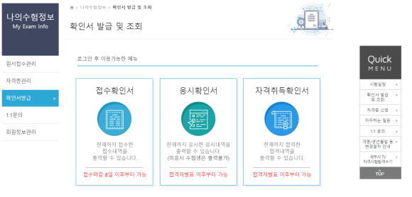 자격증을 받는데 2주 정도 걸리는데 급하게 자격증을 어디에 제출해야 한다. 그러면 자격증을 발급하고 기다리지 말고 ‘확인서 발행 및 조회’ 탭에서