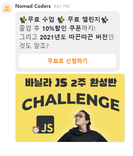 새 팀에 합류하게 된 지 한 달쯤 됐다.프론트엔드를 담당하게 되면서 자연스럽게 HTML, CSS, Javascript를 모두 배워야 하는데 팀원들에게 노마드 코더 강의가 너무 좋다고 권했고 2주 동안 도전도 해보자고 해서 2주 동안 도전을 신청하게 되었다.
