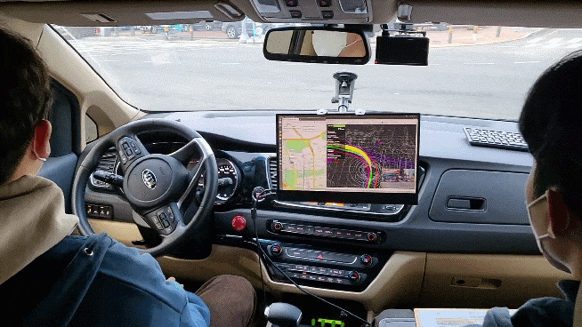 지난달 26일 기자가 탑승한 카카오모빌리티 자율주행 택시가 경기 성남시 판교의 한 교차로에서 자동으로 핸들을 꺾어 부드럽게 좌회전하고 있다.어, 무단횡단하는 사람이? 기자 얘기가 나오자마자 자율주행 택시가 스스로 차선을 바꿨다. 그렇게 도로 한가운데를 가로지르던 무단횡단 노인을 자연스럽게 피했다. 핸들에 손을 댄 사람은 아무도 없었다.지난달 26일 경기 성남시 판교알파돔 빌딩 앞. 시범 운영 중인 카카오모빌리티의 자율주행 택시를 기자가 직접 카카오 T앱으로 탑승해 봤다. 검은 밴에 오르니 직원들이 운전석과 조수석에 앉아 있었다. 운전대를 건드리지는 않지만 비상 상황 때는 사람이 개입해야 하기 때문이다. 차량 안에는 카메라와 라이더 등 센서를 통해 주변 차량의 진행 방향, 장애물, 신호등 등 교통상황을 실시간으로 확인할 수 있는 모니터도 장착돼 있었다.