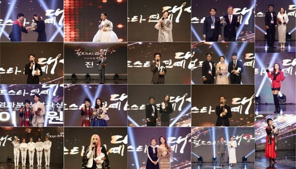 김태영 국악 트로 가수가 인기상을 받고 있다 사진=린브랜드 엔터테인먼트 월드스타 연예인 대상(연출 이아일)은 국내외 드라마, 영화, 뮤지컬, 연극, 가요, 스포츠 등 각 분야에서 왕성한 활동을 이끌어온 문화·연예인들을 기리고 격려하는 자리를 마련하기 위해 기획된 ‘국내 최대의 종합예술 시상식’이다.