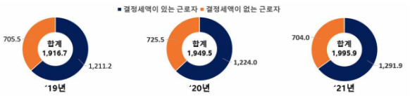 2021년 귀속 근로소득 연말정산을 신고한 근로자는 1,995.9만명으로 전년(1,949.5만명) 대비 2.4% 증가한 46.4만명이었습니다. 그 중 결정세액이 없는 근로자는 704만 명으로 전년에 비해 1.9%p 감소한 것으로 나타났습니다.<연도별 근로소득 연말정산 신고현황>