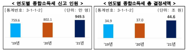 2021년 귀속 종합소득세 신고 인원은 949.5만 명으로 비사업소득자(근로·연금·기타소득)를 위한 모두 충족 서비스 확대 제공 등으로 전년(802.1만 명) 대비 18.4% 증가했습니다. 또 종합소득세 총결정세액은 44.6조원으로 전년(37조원)에 비해 20.5% 증가한 것으로 나타났습니다.