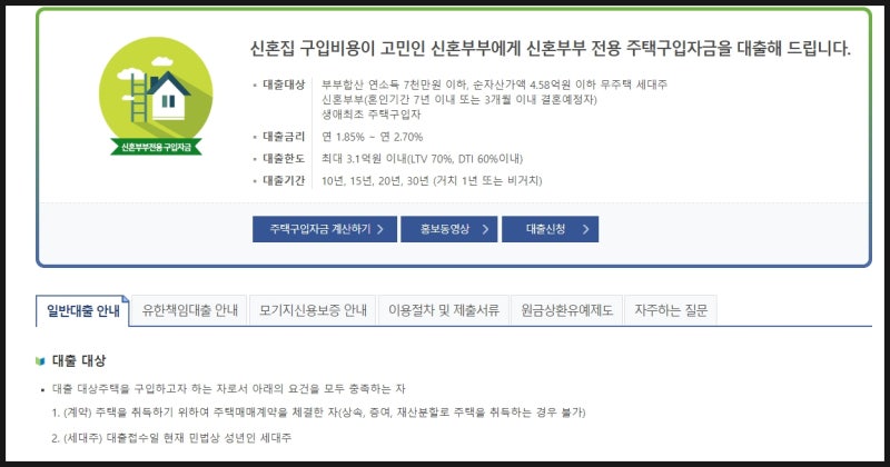 부부합산 연소득 4.58억원 이하, 순자산가액 7천만원 이하 무주택 세대주이면서 혼인기간 7년 이내 신혼부부라면 대출금리 1.85%~2.7%의 저렴한 금리로 주택매매대출이 가능하다. 신혼부부 주택 매매 융자 조건