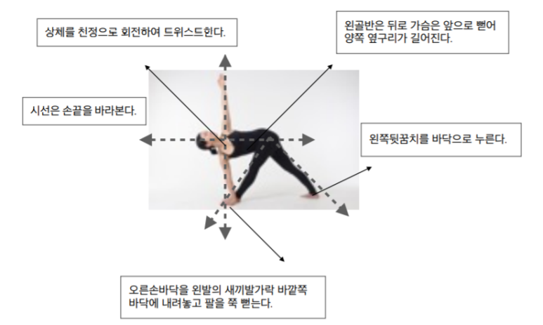 Parivrtta Trikonasana (parivrtta 회전한다. tri 삼각, kona 각도) 비튼 삼각자세 – 복부기관을 자극하여 소화기능을 개선한다.- 오금, 종아리를 스트레칭하고 다리 근육을 강화한다.- 골반과 척추를 스트레칭하여 등 통증을 경감시킨다.- 균형 감각을 기르다.- 저혈압 두통 설사는 이 자세를 수련하지 않는다.