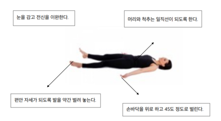 Savasana(sava 송장)송장 자세-이 자세는 모든 정신생리학 시스템을 이완시킨다.몸이 완전히 이완됐을 때 자각 능력은 증가하고 제감을 발달시킨다.